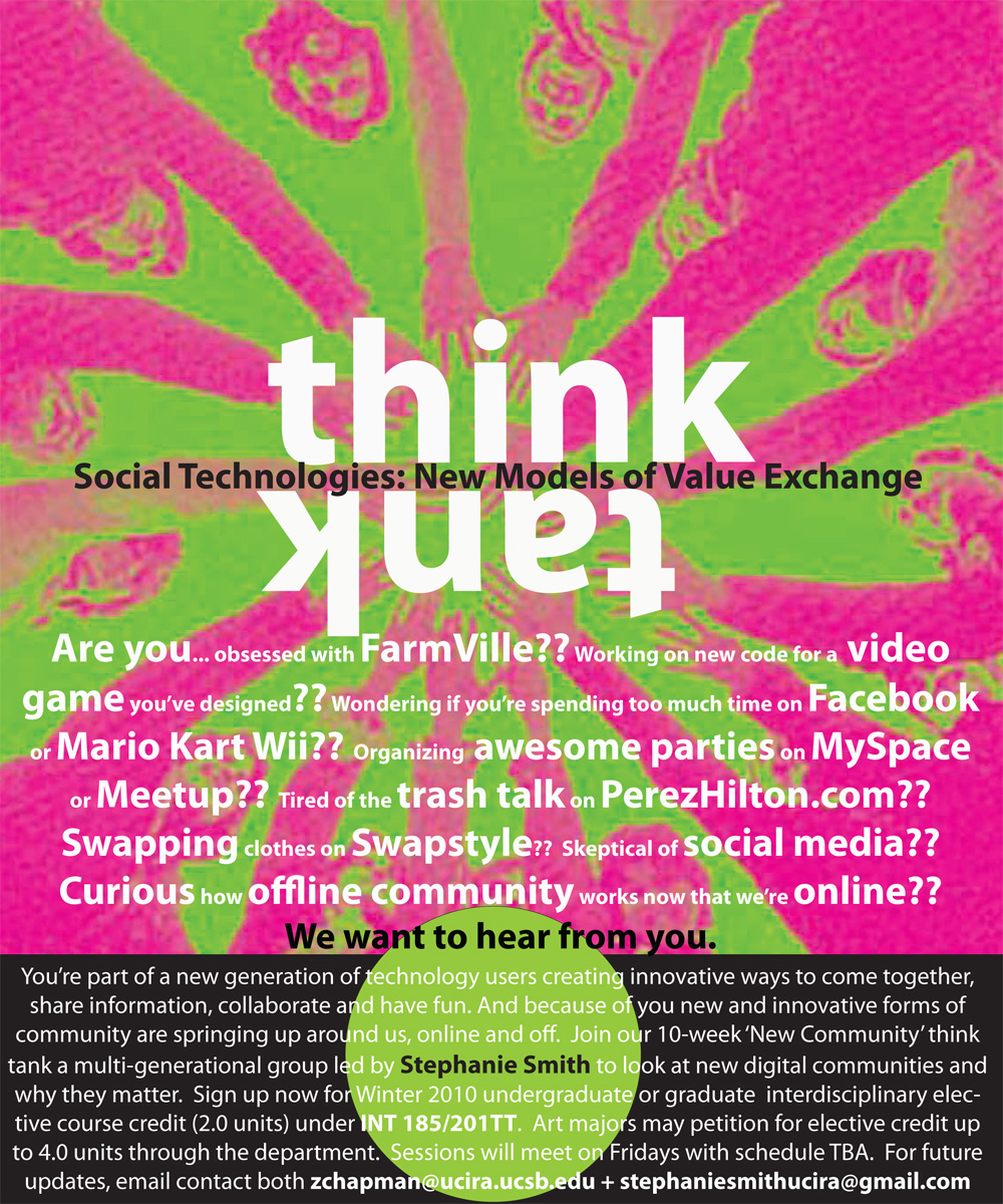 You’re part of a new generation of technology users creating innovative ways to come together, share information, collaborate and have fun. And because of you new and innovative forms of community are springing up around us, online and off. Join our 10-week ‘New Community’ think tank a multi-generational group led by Stephanie Smith to look at new digital communities and why they matter. Sign up now for Winter 2010 undergraduate or graduate interdisciplinary elective course credit (2.0 units) under INT 185/201TT. Art majors may petition for elective credit up to 4.0 units through the department. For information and updates, email contact both zchapman@ucira.ucsb.edu and stephaniesmithucira@gmail.com