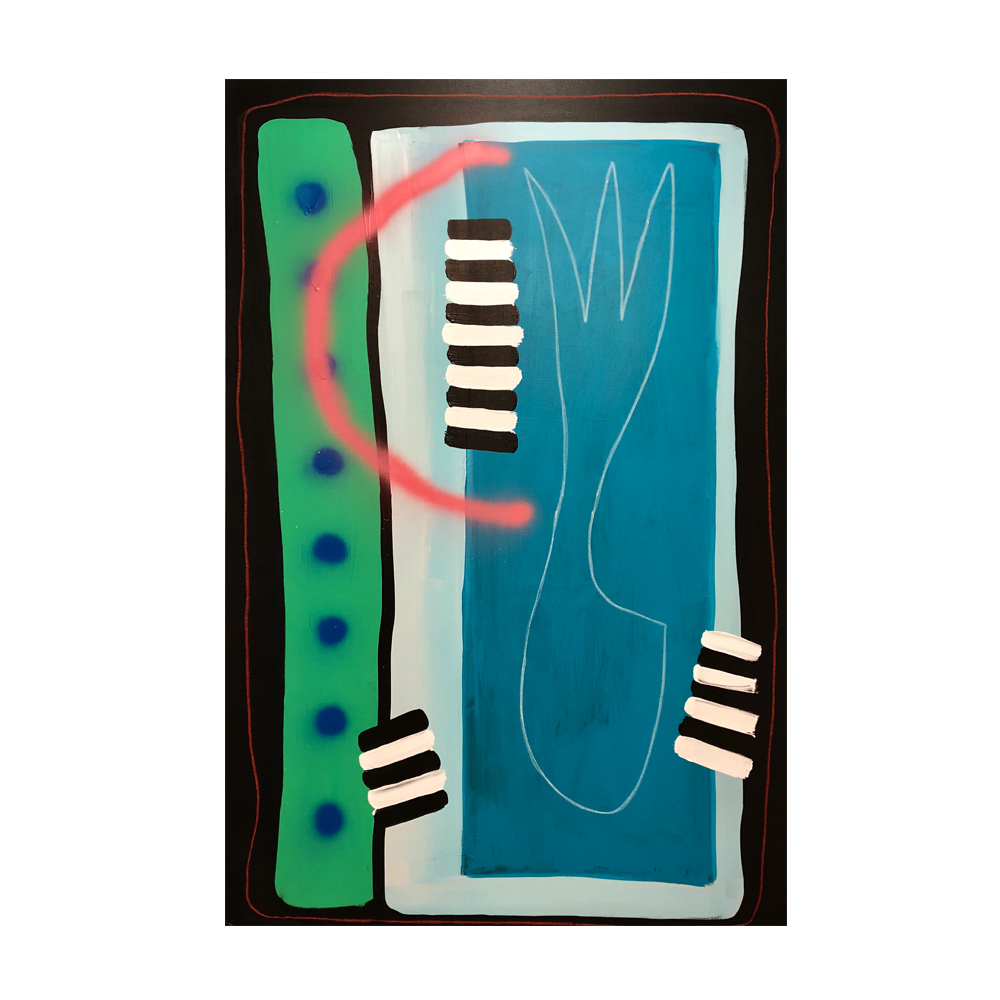 Her paintings suggest hectic movement, but also the stillness locked in each gesture of that movement. Her work is “rooted somewhere between the insanity of Kandinsky and the line-certainty of the early 20th century Futurists.” Each painting is a piece of the complex topography that defines both her identity and her work. Through the narratives created by a methodical application of color, she delivers an invocation of home—spectral and surreal, but familiar too.